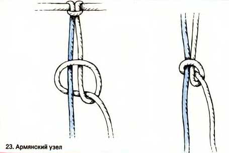Этот узел имеет еще названия "кулачок", "сборный", "скользящий". Выполняют его аналогично галстучному с той лишь разницей, что работу начинают с правого простого узла (рис. 23).